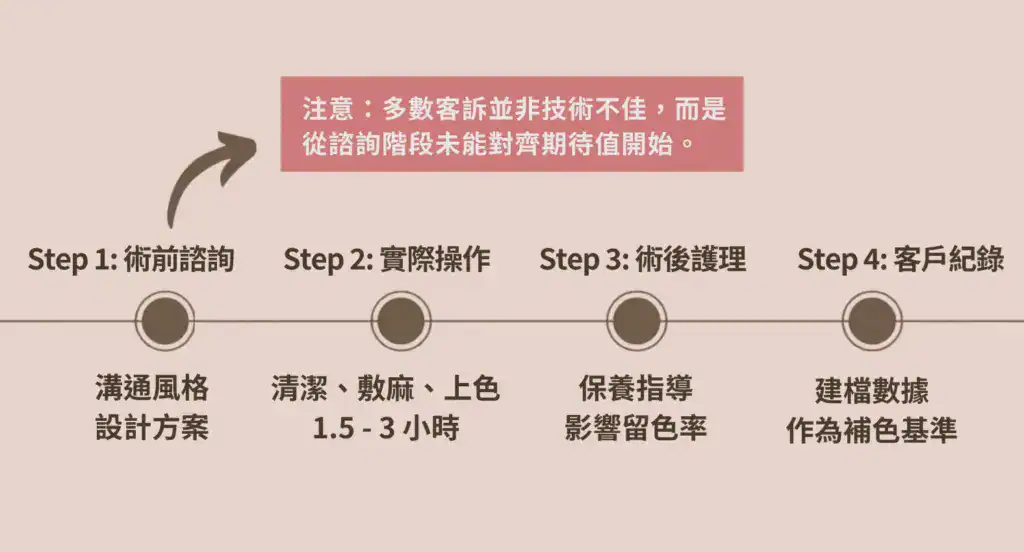 - 溝通能力:很多客訴不是因為技術不好,而是術前期待值沒有對齊——能精確了解客人需求、清楚說明操作細節,是避免糾紛的根本。