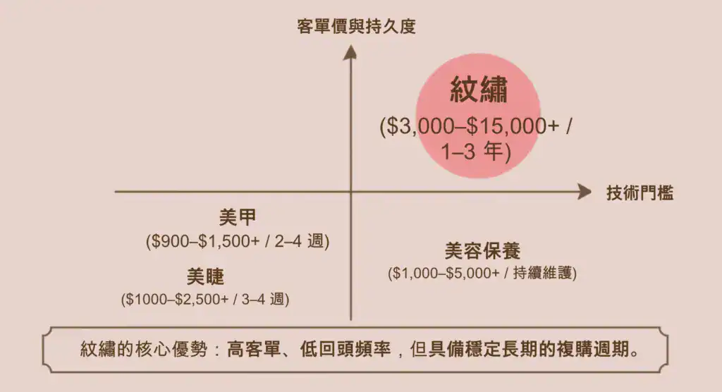 紋繡的核心優勢很清楚:高客單、低回頭頻率,但複購週期穩定。 技術門檻雖然高,但一旦建立口碑之後,相對不容易陷入低價競爭的泥淖,這也是很多美業從業者選擇轉投紋繡的主要原因。