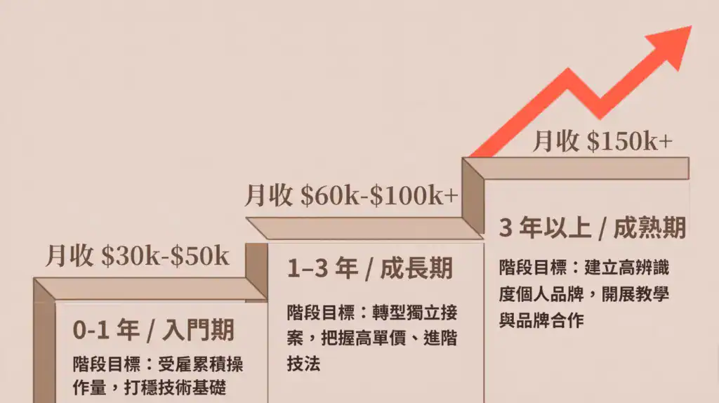 ▐ 入門期(0–1 年): 受雇模式下,月收入通常落在 3 至 5 萬元之間,視工作室規模與所在地區有所差異。這個階段最重要的事是累積操作量,而不是急著追求收入,紮實的技術基礎才是後期收入的真正來源。