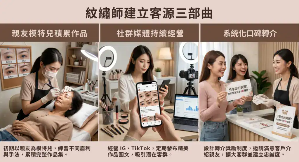 - 社群媒體持續經營: Instagram 和 TikTok 是目前台灣紋繡師最有效的新客獲取管道。重點不是每天貼文,而是視覺風格的一致性——讓人看到你帳號的第一眼,就知道你做的是什麼風格的作品。