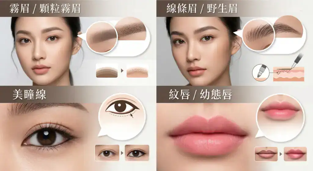 - 霧眉 / 顆粒霧眉:重塑眉型,改善稀疏或不對稱問題,是接受度最高的入門項目