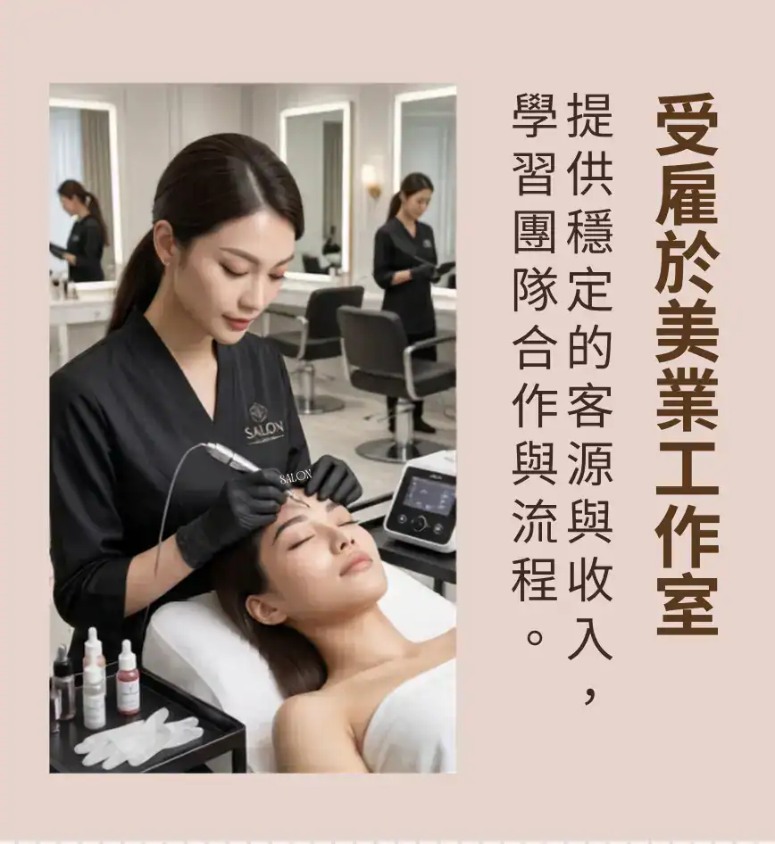 - 受雇於美業工作室或美容院: 初期最常見的模式。優點是有穩定的客源流量,不需要自己開發,適合剛入行、需要快速累積操作量的新手。通常採底薪加抽成制,收入和接客數量直接掛鉤,初期月收大約在 3 至 5 萬元之間。