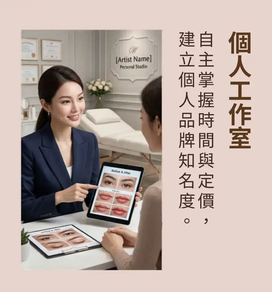 有固定客流、不需要自己開發市場,是新手累積操作量、建立手感最低風險的第一步,也是多數人入行的起點 - 自立門戶:個人工作室